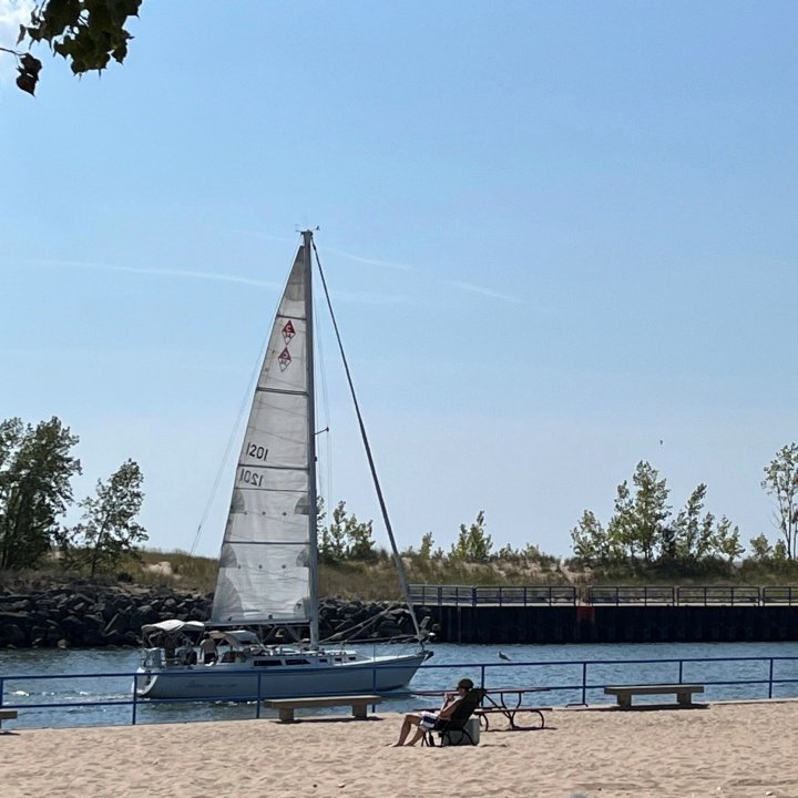 Todd’s been on vacation all week but has been getting over being sick. Today we had a lovely lunch outside by a lake in Holland and then went to the beach and watched boats come thru the channel. The weather and breeze were perfect!