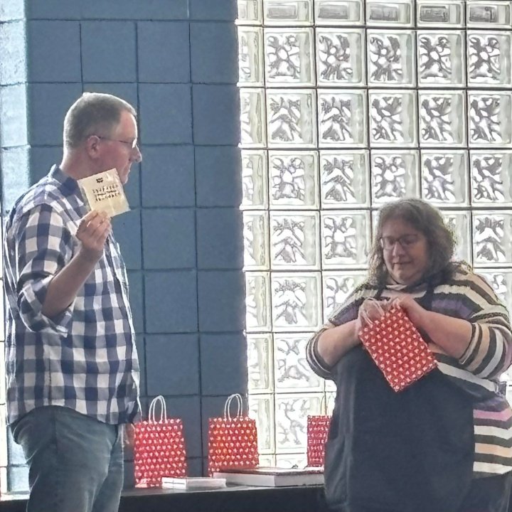 This year I gave fewer prizes away. Everyone received product for their projects and plenty to take home! Here’s My Love helping draw names and deliver prizes.