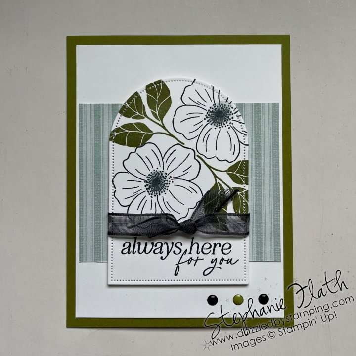 You can’t see it very well, but I colored the center of the flowers with Wink of Stella. I used several items from the Lovely Blossoms Suite. The colors here are Old Olive, Secret Sea & Cloud Cover.