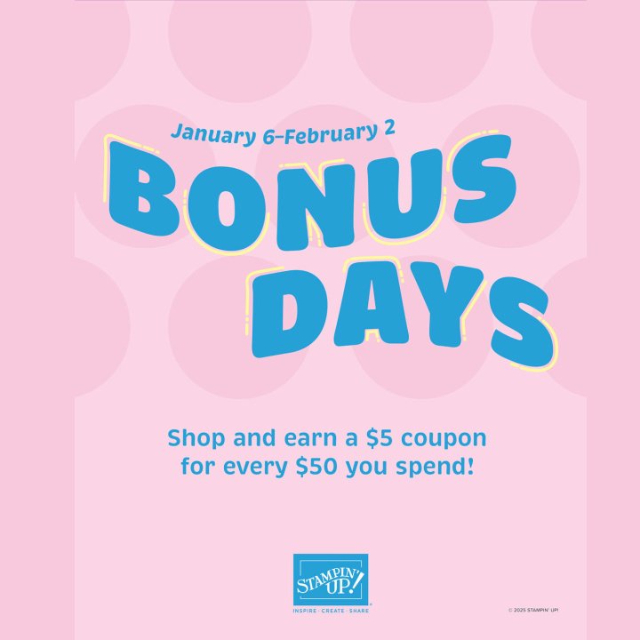 4) Bonus Days are coming tomorrow, 1/6-2/2! For every $50 you spend, you receive a $5 bonus code in your email inbox. Then REDEEM the codes 2/3-2/28! PLUS, you still earn your 10% Stampin’ Rewards on your orders!