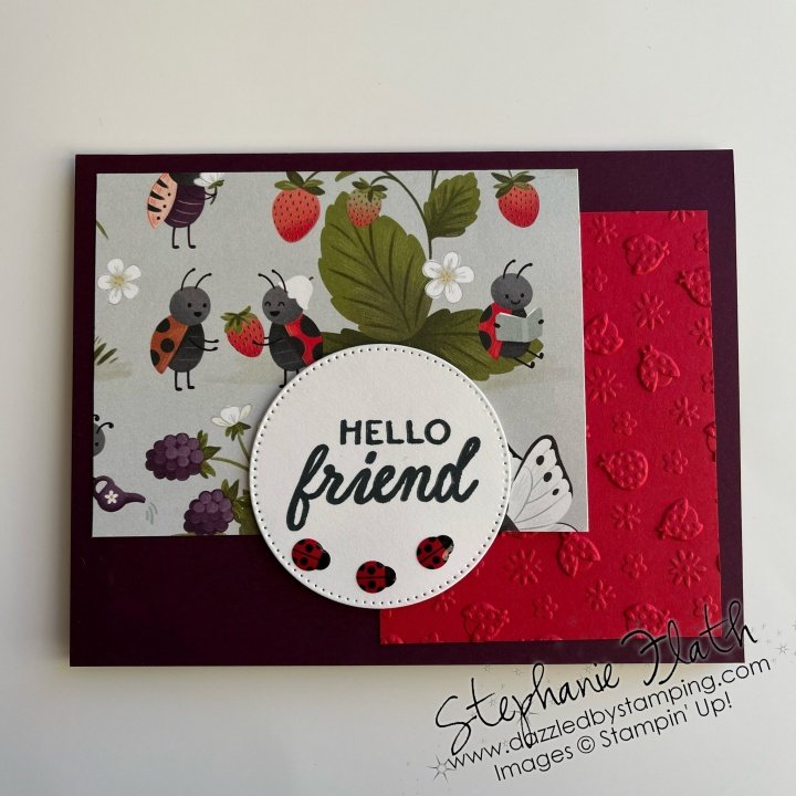Ok, so here’s the card. It features an upcoming Online Exclusive–#167478 Ladybug Picnic 3D embossing folder. It will be available to everyone on March 3! We demonstrators can preorder it–obviously. And I couldn’t NOT use it for our bugs class!!! You can ALSO choose it NOW if you join my team right now! In addition, you’ll also receive the new Stampin’ Positioner free in your Starter Kit!