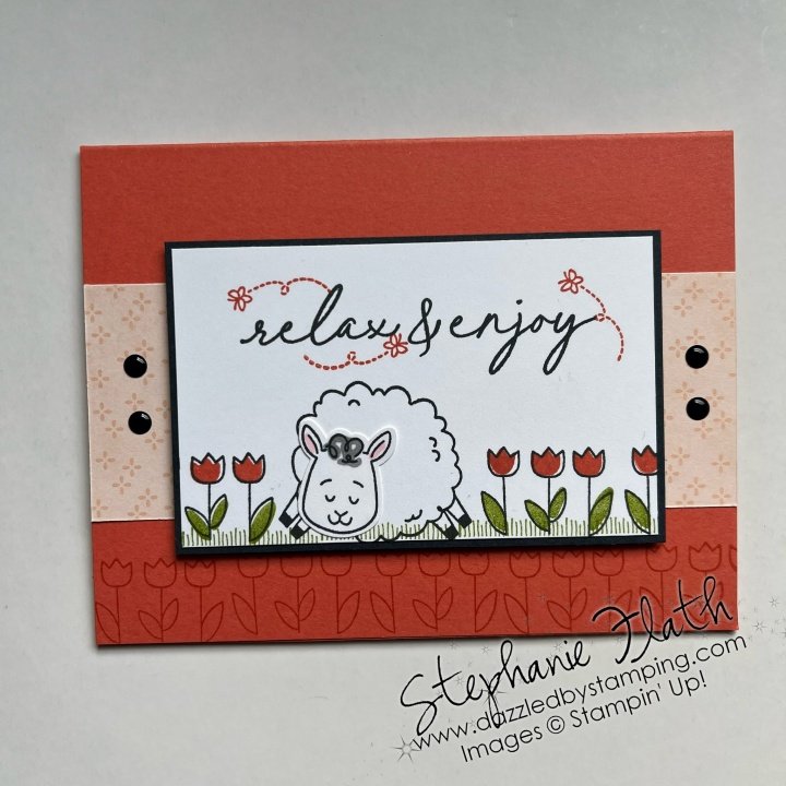 In fact, I’m sharing my samples from my Dazzling Card Club with them this week. First is my change up on the Sleepy Sheep. I had to go with colors that coordinated with the DSP we were using. This is Calypso Coral, Petal Pink & Secret Sea: