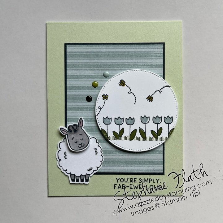 THIS card is my FAVE Woolly Friends card we made in my Dazzling Card Club. I love the colors–INCLUDING the color of the sheep itself! The sheep with black faces and feet are so cute!! We couldn’t give ours black faces, because then we couldn’t SEE their faces! That would be sad.